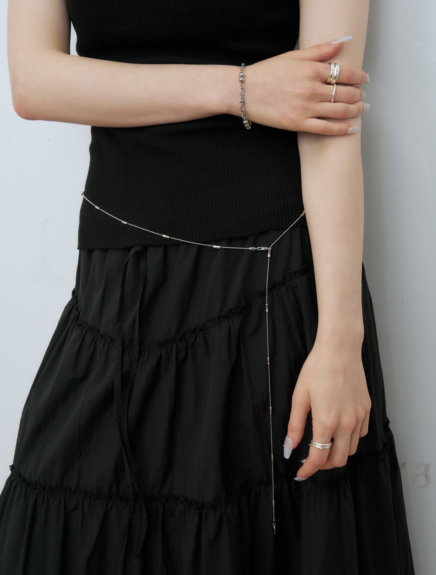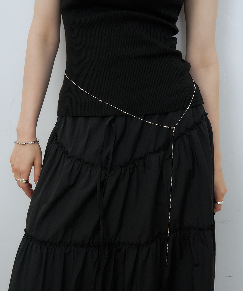 - 얇고 유연한 실루엣과 구조적인 체인 디테일이 돋보이는 벨트 체인