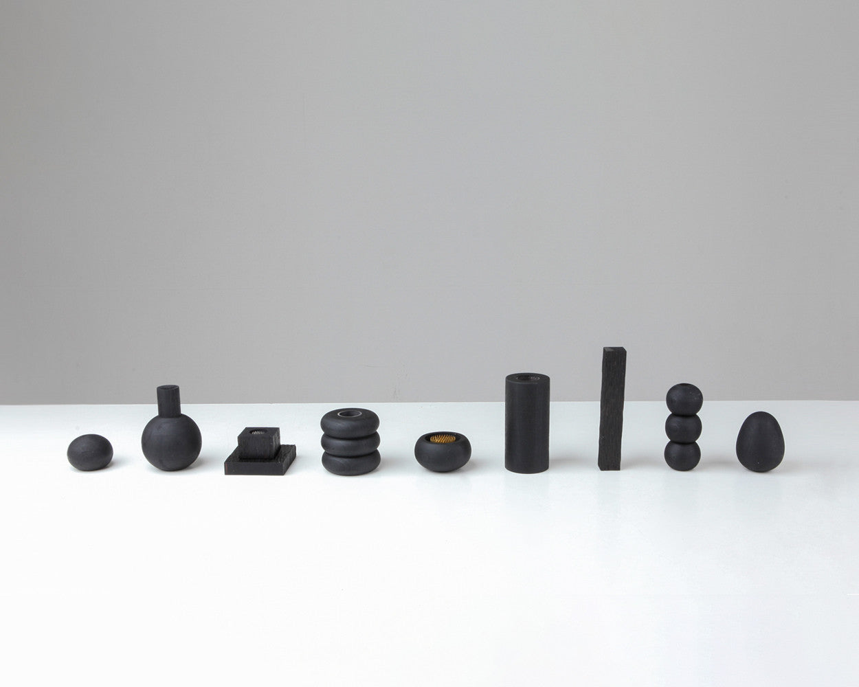 에보나이징 기법으로 마감한 오브제 시리즈이다. 시리즈는 목선반을 활용한 좌우대칭의 둥근 형태 혹은 사각형에서 비롯되며 ‘018’은 이러한 디자인 언어를 함축해서 보여준다. 기물은 어떤 형태로든 확장될 수 있다.