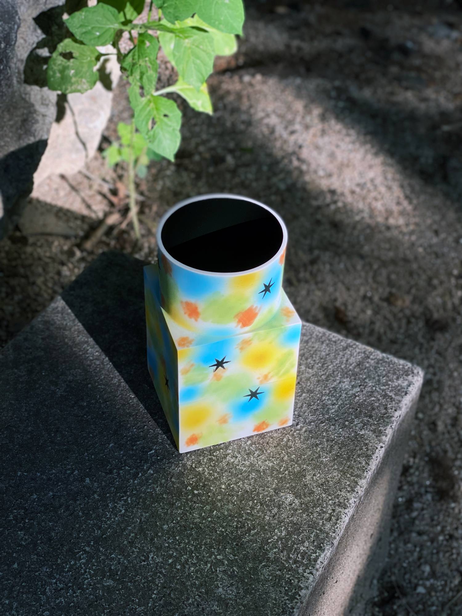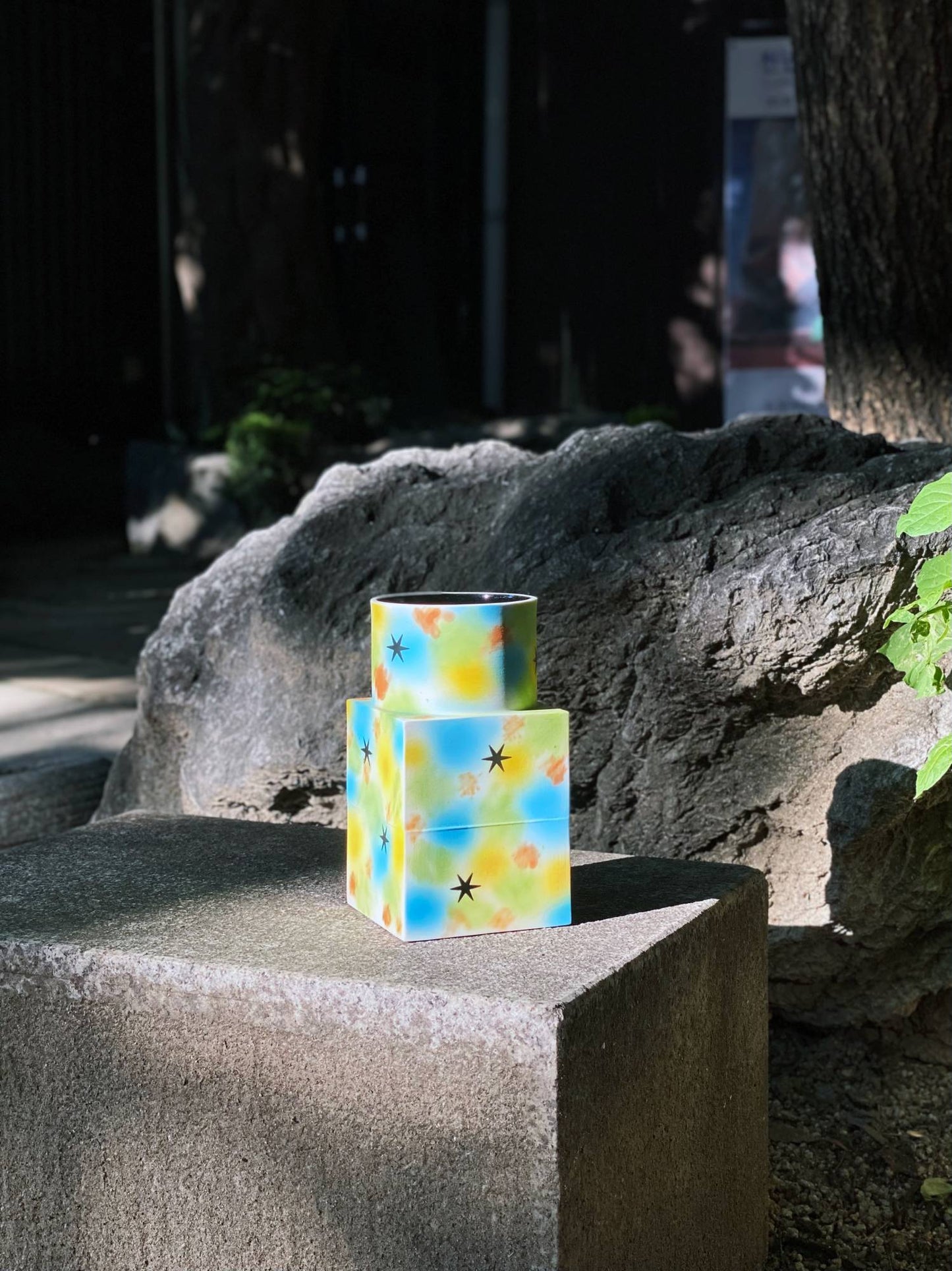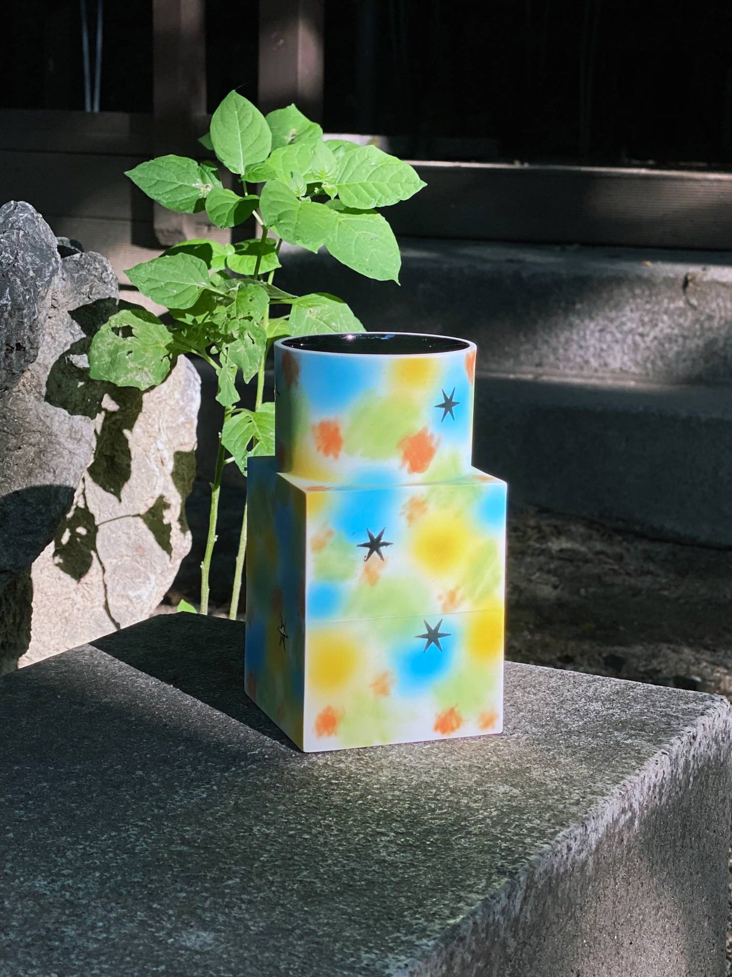 석고틀을 사용하여 슬립 캐스팅 기법으로 만든 뉴베이스 시리즈 중, 원기둥 1개와 직육면체 2개를 쌓아 만든 형태입니다. 스프레이 기법으로 다양한 색을 입혔고 검은 별은 반짝일 수 있게 유약으로 마무리 하였습니다.