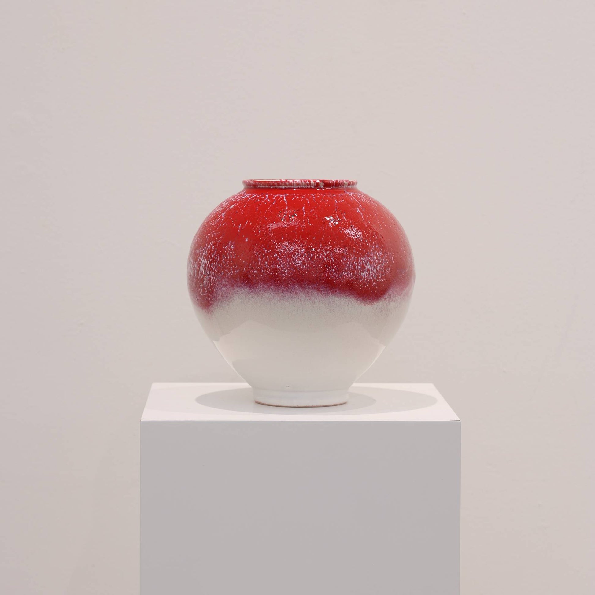 $1280도에서 소성되었으며 세 가지 유약이 층층이 겹쳐 있습니다. 상단의 붉은 유약은 부드러운 흰색으로 희미하게 사라지기 전에 바깥쪽으로 피어나며, 확장되는 빛을 반영하는 은은한그러데이션을 만듭니다.