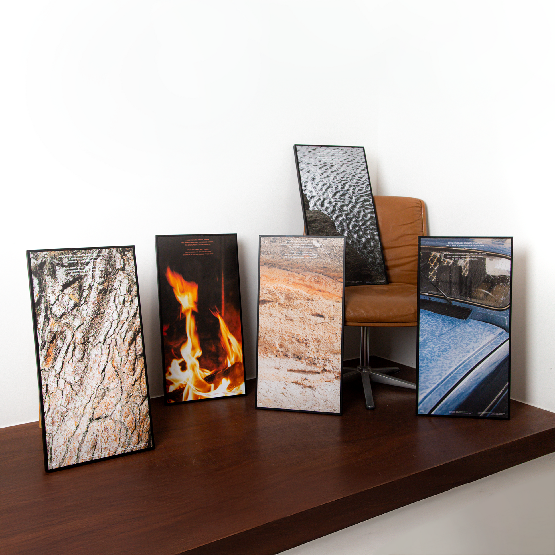 나무 껍질, 타오르는 불꽃, 고요한 물결 등 각 기운의 상징적 이미지를 통해
